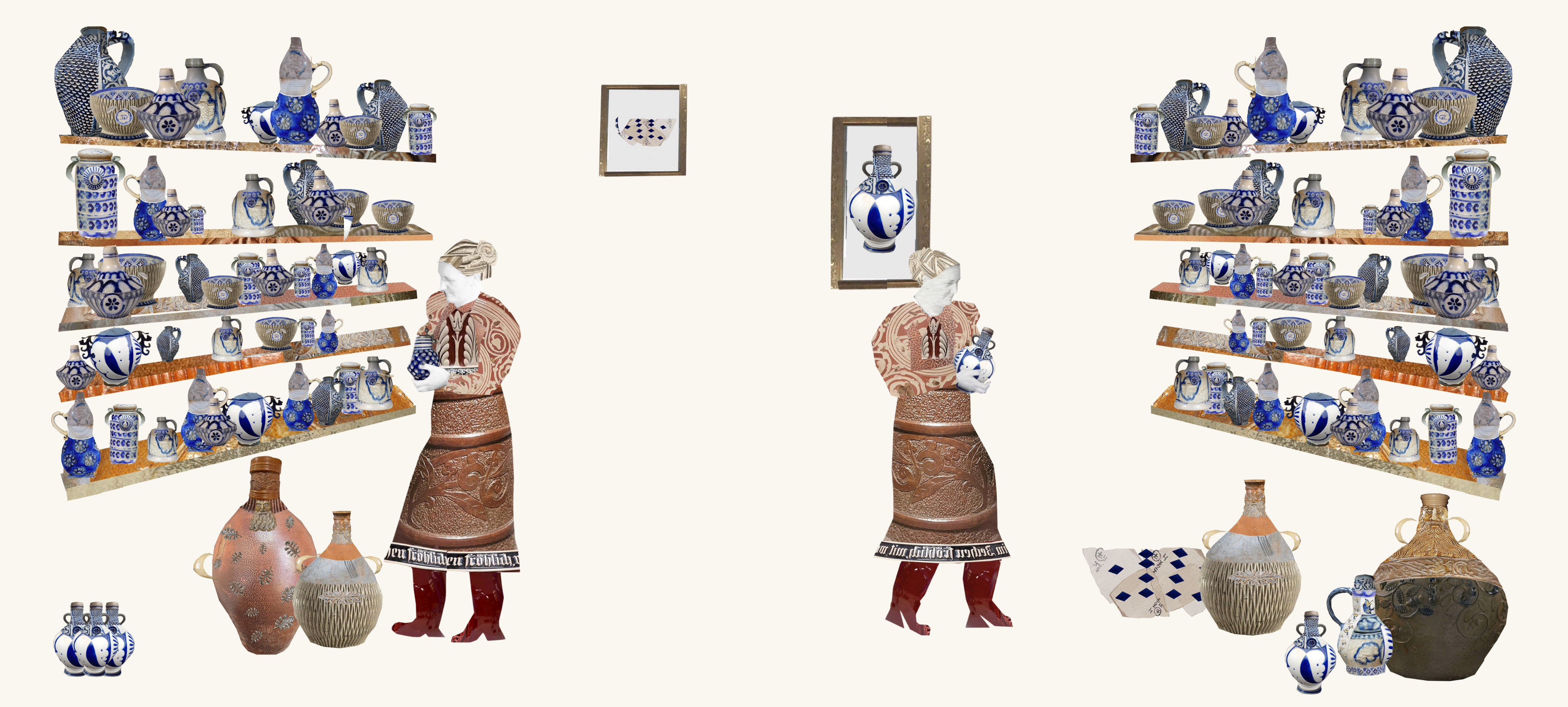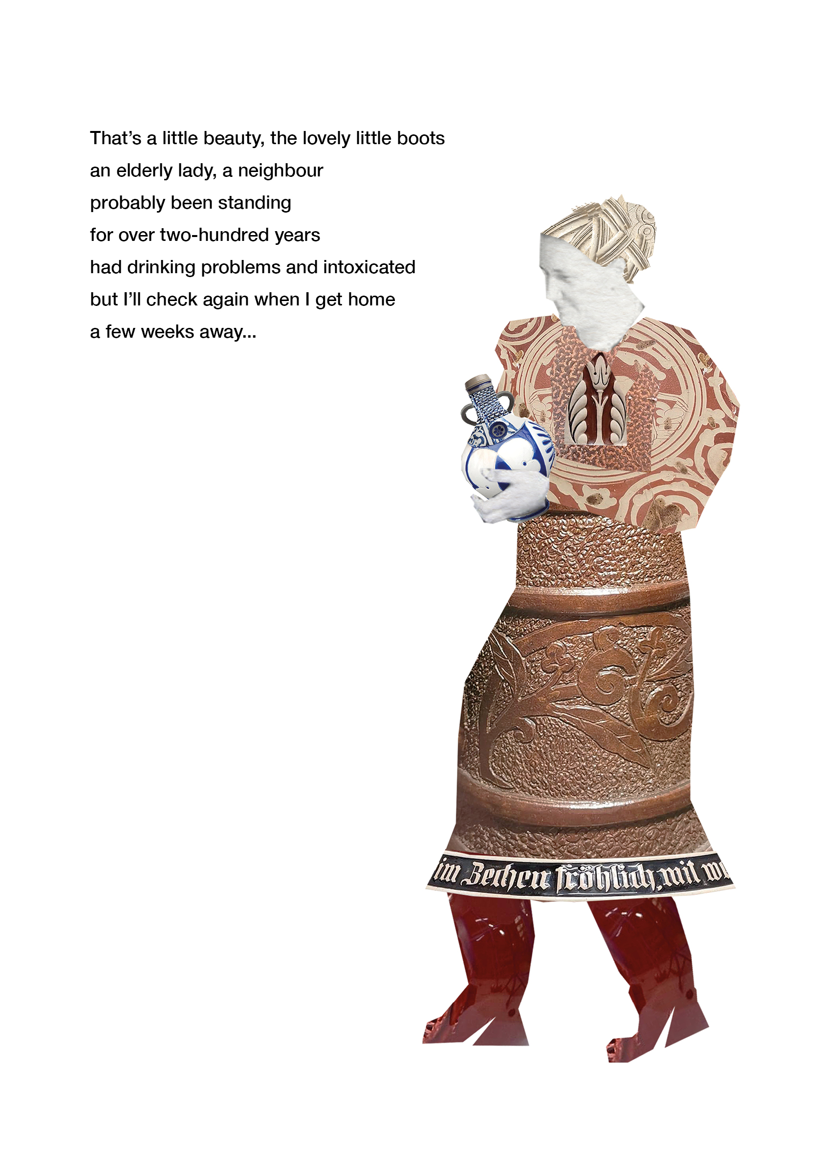 From process-led research, I discovered a Facebook group called ‘Bellarmine and Bartmann and other early stoneware jug/bottle, and earthenware’. It had 1.1K group members, including both archaeological experts and fanatics. Every day there were more and more posts of people sharing their objects with us and asking for stories about them. These strangers had created an online archive full of passion and information. This encouraged me to look at how heritage creates community and how illustrators can use it to tell a story. My visual research method for this project was to cut up the images people had shared and digitally collage them as illustrations. The text in my poster was words written in the posts and comments by the people in this group. Like the images, the words were snipped-up poetry to reflect the breadth of conversation.