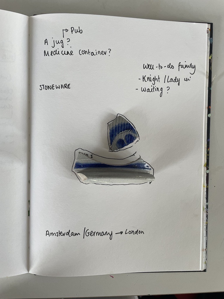 For the project, each student chose one ‘de-selected’ archaeological object from Recycle Archaeology’s archive. The objects I chose from the archive were two ceramic fragments. Helen predicted it was a type of stoneware from Germany from the 16th or 17th century. I was curious about how it had ended up here in London, so I set about my research on this object.